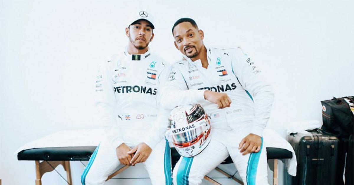 Lewis Hamilton with actor and Will Smith who brought down the chequered flag at the Yas Marina circuit at the Abu Dhabi Grand Prix on Sunday