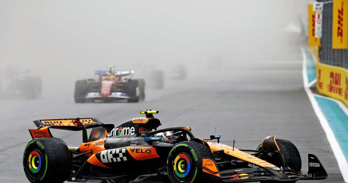 Lando Norris lucked in to win a rain-hit and crash-strewn Miami Grand Prix sprint race in a McLaren one-two on Saturday that trimmed teammate Oscar Piastri's Formula One lead to nine points.