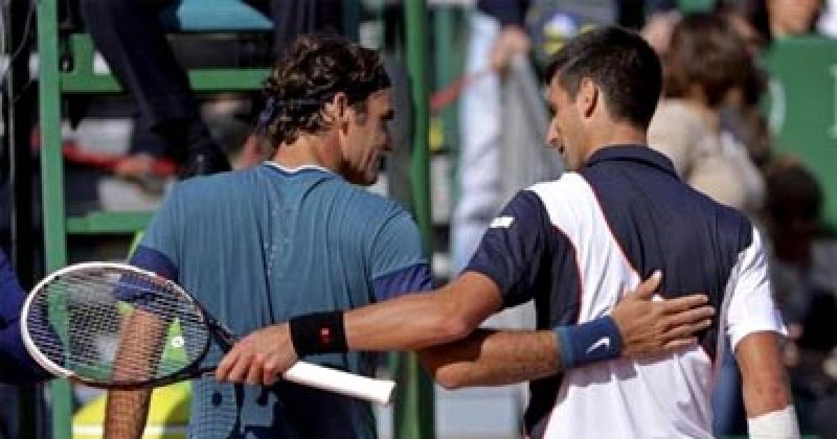 Image: Novak Djokovic (right) congratulates Roger Federer after their semi-final match at the Monte Carlo Masters.