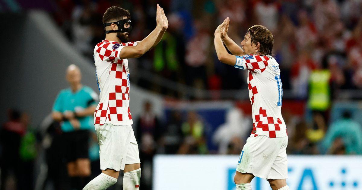 Croatia's Luka Modric and Josko Gvardiol celebrate after the match as Croatia qualify for the knockout stages