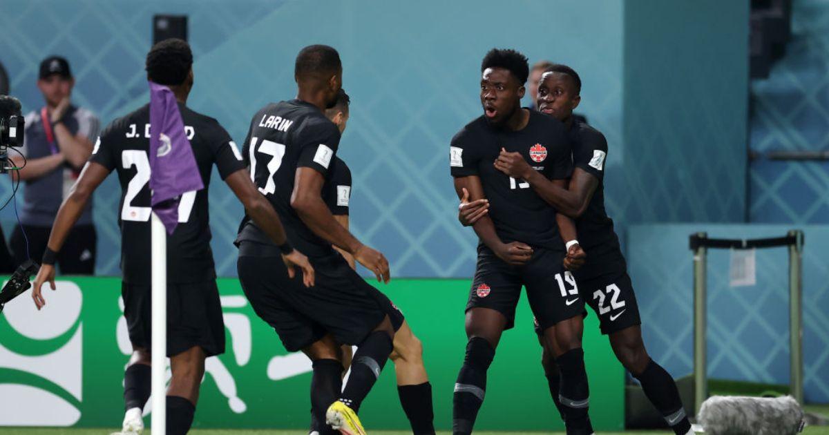 IMAGE: Canada's Alphonso Davies (2nd R) celebrates after scoring his team's first goal with teammates during the FIFA World Cup Qatar 2022 Group F match between Croatia and Canada. Photograph: Alex Grimm/Getty Images