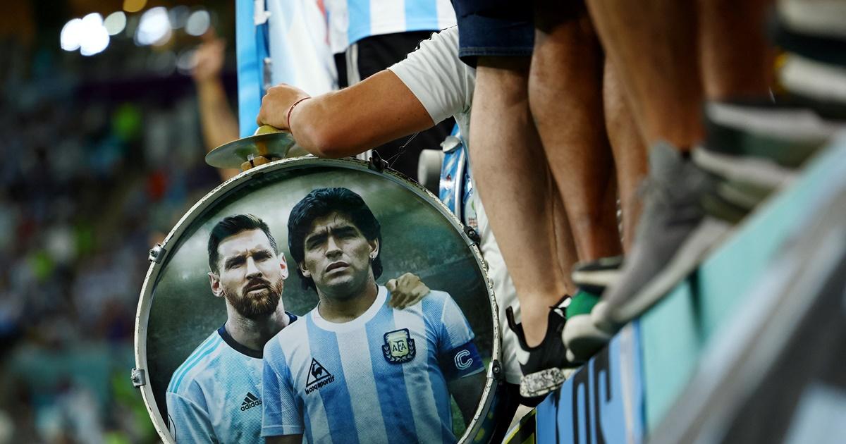 IMAGE: Lionel Messi and Diego Maradona are pictured on a fan's drum during the World Cup quarter-final between the Netherlands and Argentina at Lusail Stadium, in Lusail, Qatar, on Friday. Photograph: Molly Darlington/Reuters