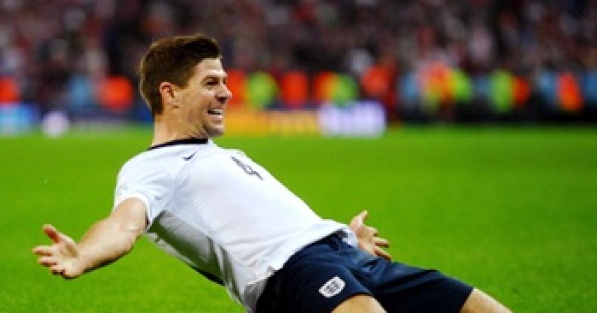 Image: Steven Gerrard celebrates after scoring England's second goal during the FIFA 2014 World Cup Qualifying Group H match against Poland at Wembley Stadium
