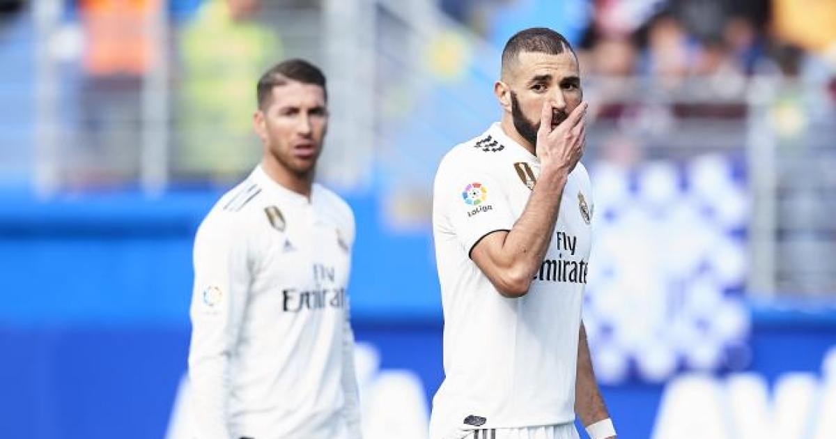 IMAGE: Real Madrid's Karim Benzema and Sergio Ramos (background) wear a dejected look during their La Liga match against SD Eibar at Ipurua Municipal Stadium in Eibar on Sunday. Photograph: Juan Manuel Serrano Arce/Getty Images