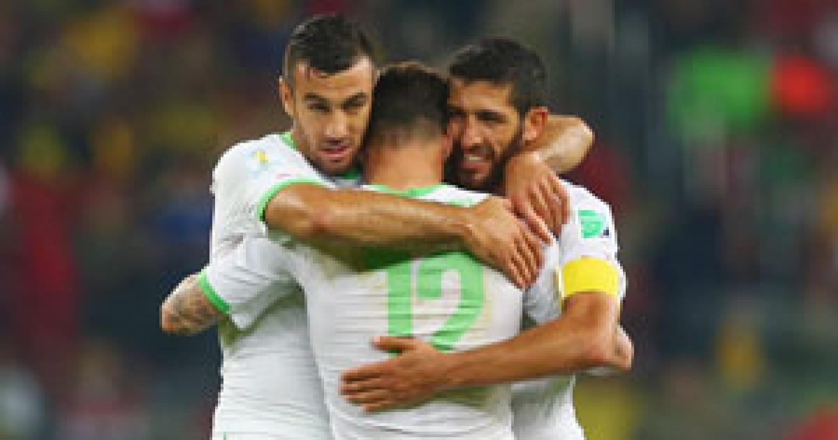 Image: (left to right) Essaid Belkalem, Carl Medjani and Rafik Halliche of Algeria hug after defeating South Korea 4-2 in the Group H match at Estadio Beira-Rio Porto Alegre