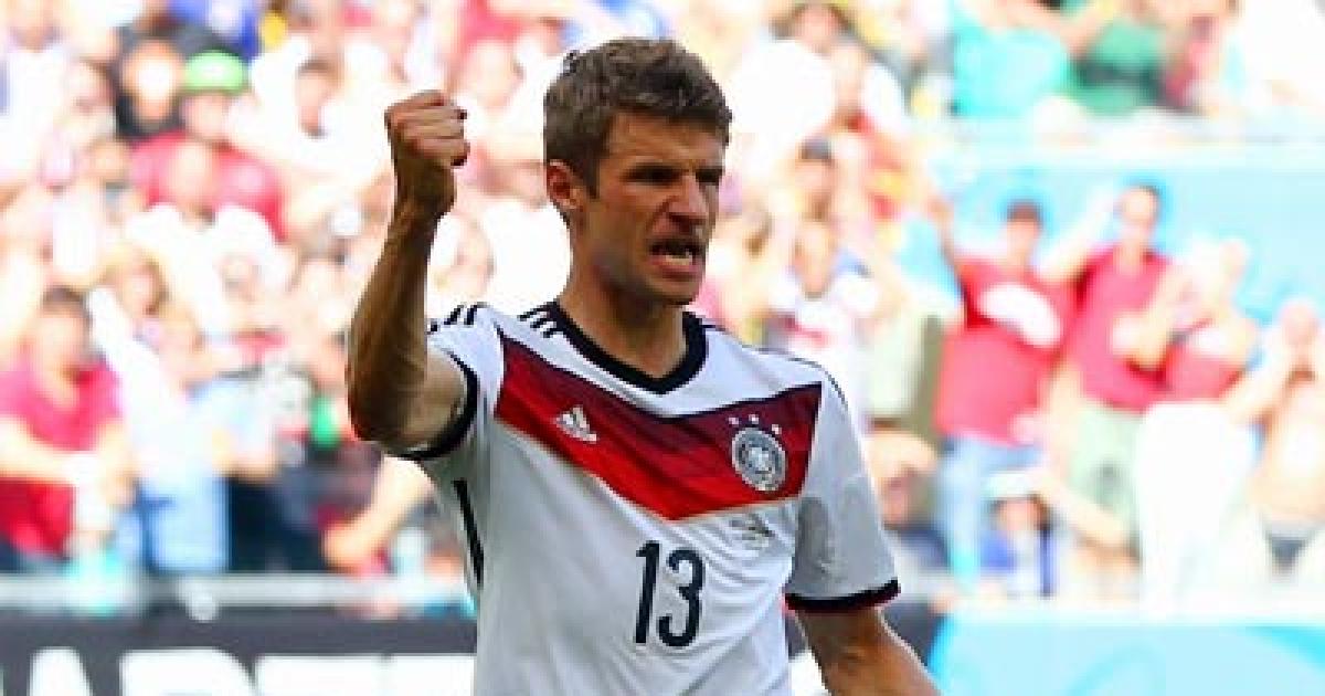 Image: Thomas Mueller of Germany reacts after scoring the first of his three goals against Portugal