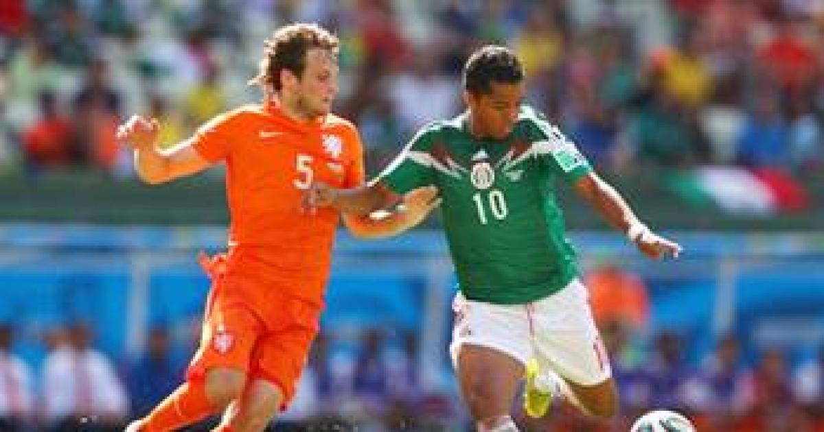 Image: Giovani dos Santos of Mexico beats Daley Blind of the Netherlands to the ball, shoots and scores to put his team into the lead in the World Cup Brazil Round of 16 match.