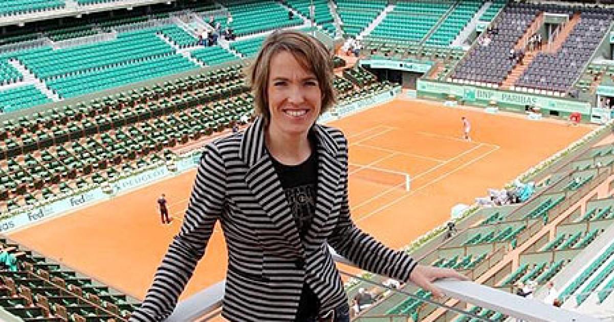 IMAGE: Former Belgian tennis player Justine Henin poses on top roof of the Philippe Chartrier court at the Roland Garros stadium in Paris.