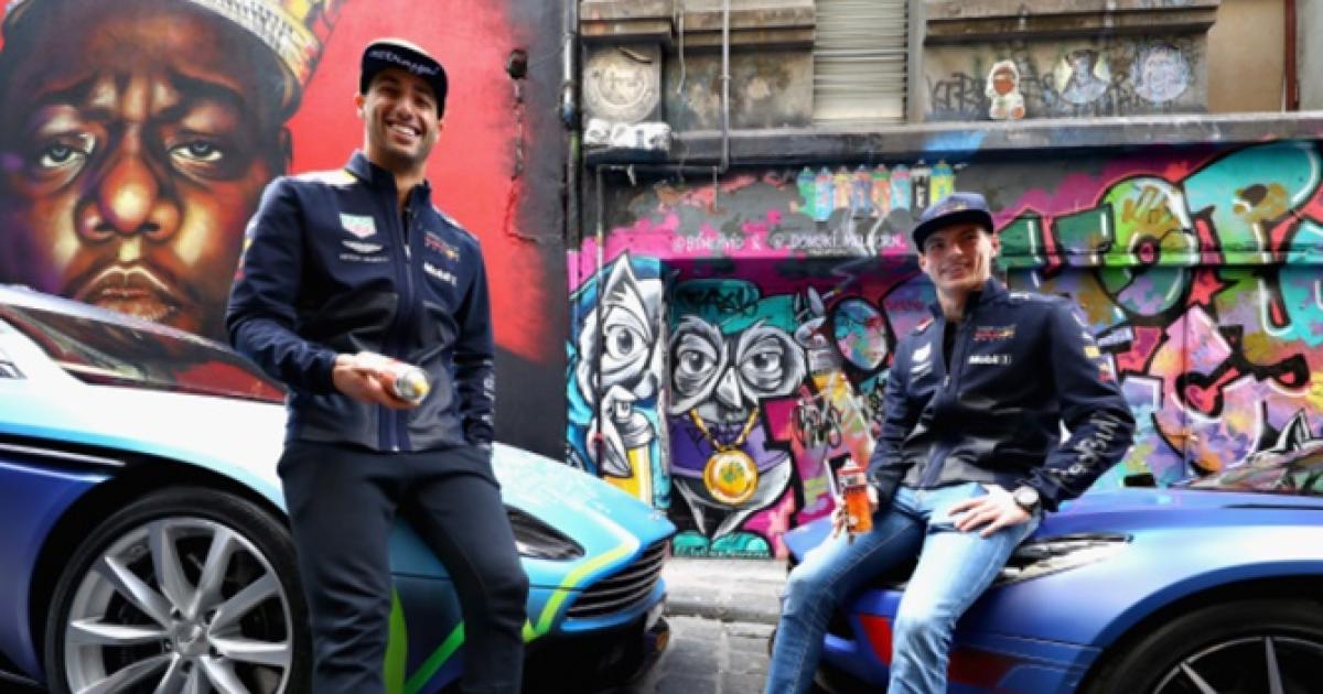 IMAGE: Red Bull Racing's Daniel Ricciardo of Australia and Max Verstappen of the Netherlands pose . Photograph:  Mark Thompson/Getty Images