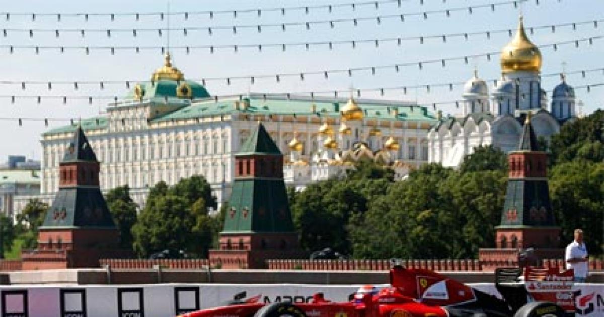 Image: Marc Gene drives the Ferrari Formula One car along an embankment of the Moskva River during the Moscow City Racing event, with the Kremlin towers seen in the background, in Moscow on, July 12, 2014.