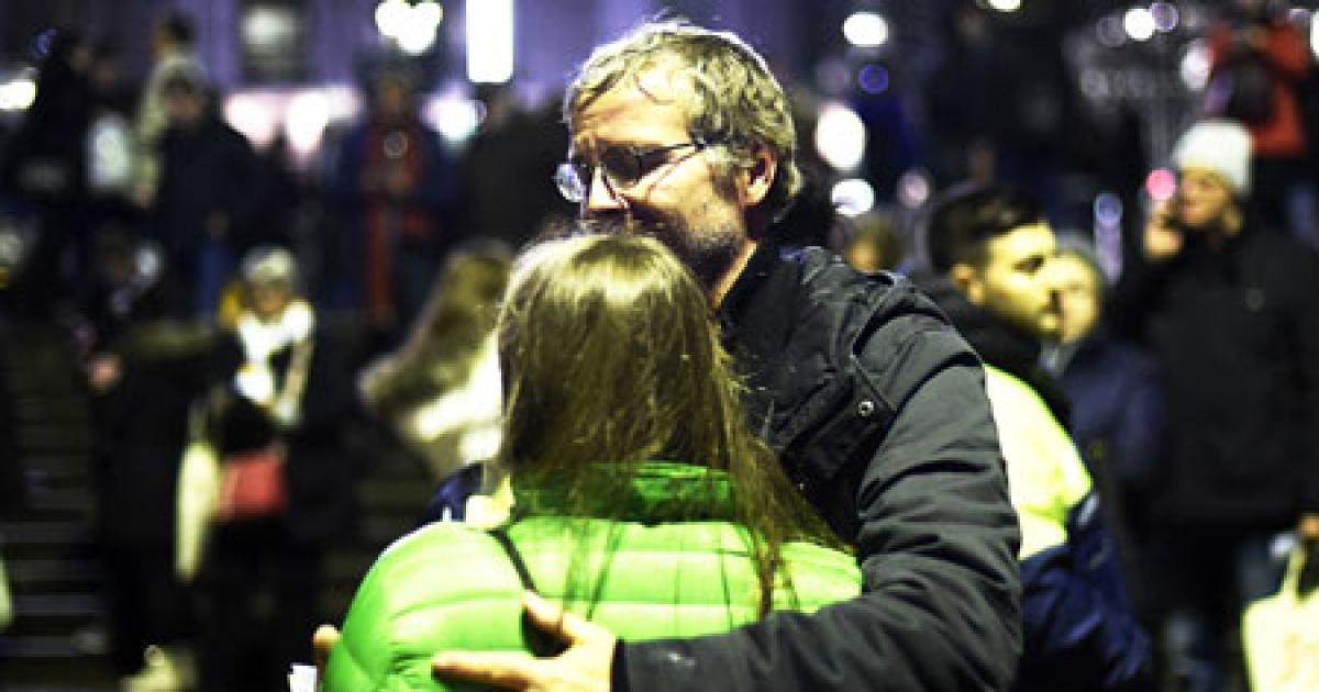 Image: People comfort each other shortly after the match between Germany and the Netherlands was cancelled following a bomb alert at the HDI-Arena in Hanover on Tuesday
