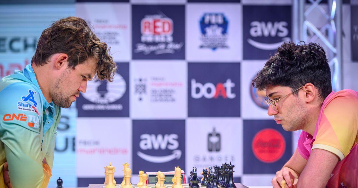 IMAGE: World Number One Magnus Carlsen takes on Alireza Firouzja. Photograph: Tech Mahindra Global Chess LeagueDay two at the Tech Mahindra Global Chess League Season 2 featured a highly anticipated duel between league favorites, the Alpine Sg Pipers, and reigning champions, the Triveni Continental Kings.
