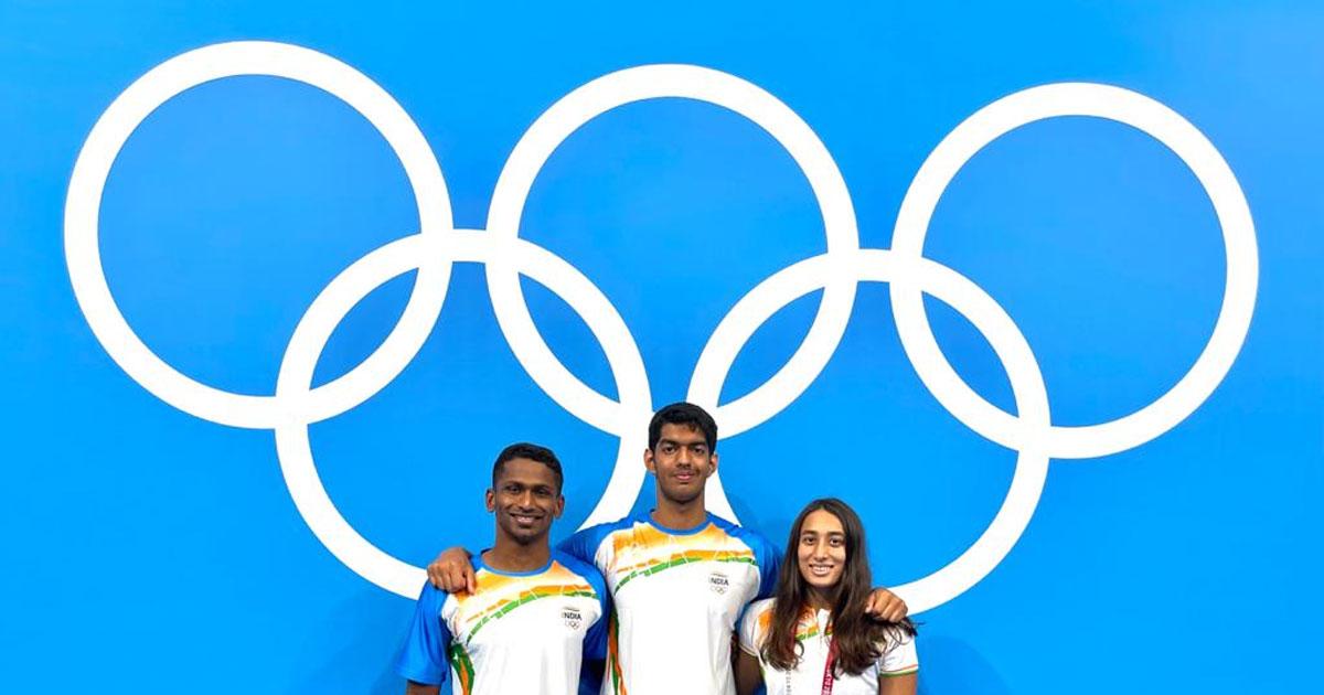 India's swimmers Sajan Prakash, Srihari Nataraj and Maana Patel pose in front of the Olympic rings at the Games Village in Tokyo