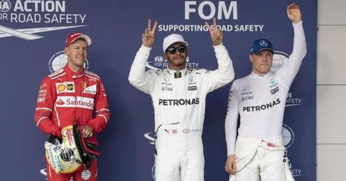 Ferrari's Sebastian Vettel, the Briton's closest rival but 59 points behind with four races remaining, qualified second with a prodigious effort just when it seemed Mercedes would sweep the front row.