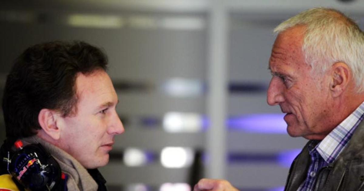 IMAGE: Red Bull owner Dietrich Mateschitz (right) speaks to Red Bull Racing Team Principal Christian Horner. Photograph: Ker Robertson/Getty Images