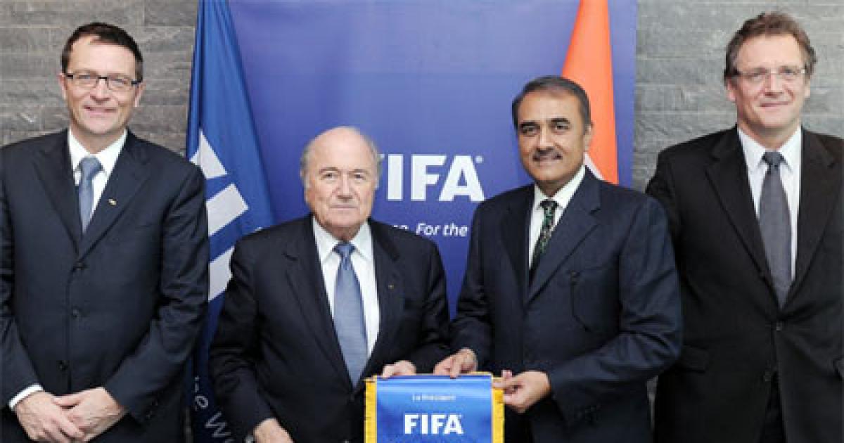 Image: (From left to right) Thierry Regenass, Joseph Blatter, Praful Patel and Jerome Valcke pose after a meeting at the FIFA Headquarters in Zurich.