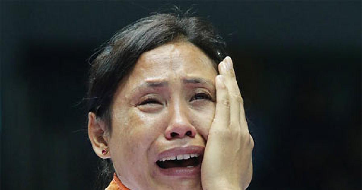 Image: L Sarita Devi of India cries after she refused her bronze medal during the medal ceremony in the Womens Light Division Final on Wednesday