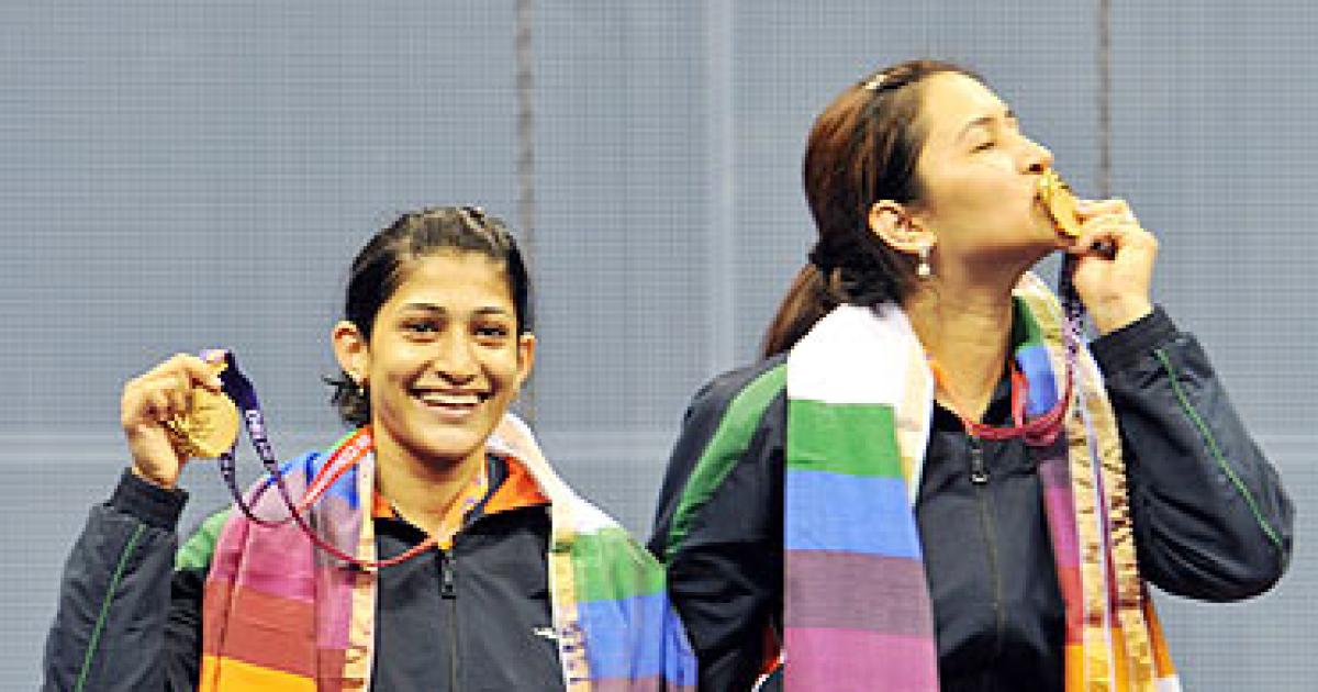 Image: Ashwini Ponappa (left) and Jwala Gutta with their gold medals at the 2010 Delhi Commonwealth Games