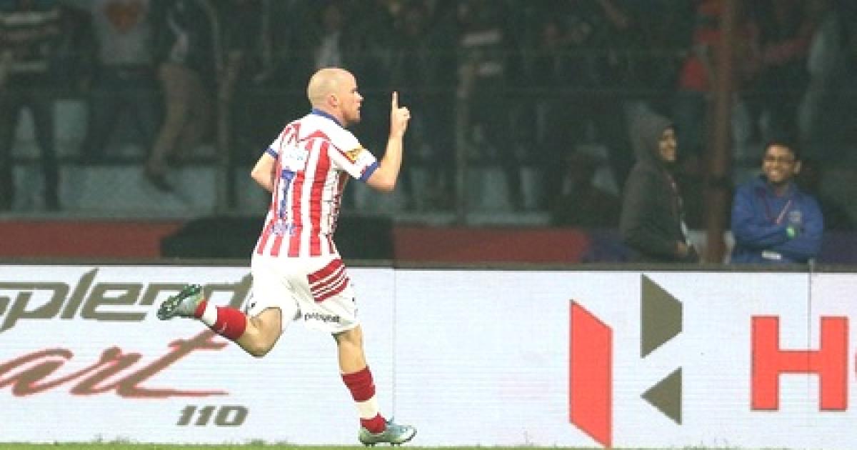 Image: Atletico de Kolkata's Iain Hume celebrates his goal against Mumbai City FC during their ISL first leg semi-finals in Kolkata on Saturday