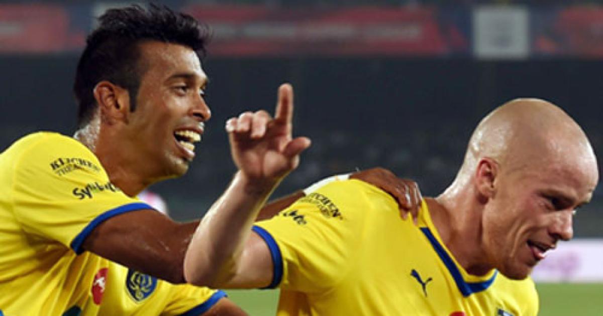 Image: Kerala Blasters' Iain Hume celebrates scoring a goal against Atletico de Kolkata during an Indian Super League match at the Salt Lake Stadium in Kolkata on Sunday.