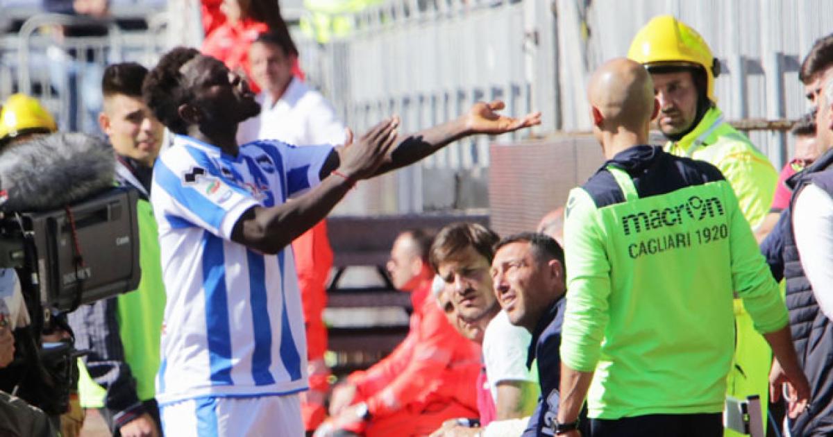 Pescara's Sulley Muntari reacts after the crowds threw racist chants in his direction during the Serie A match against Cagliari Calcio at Stadio Sant'Elia in Cagliari, Italy, on Sunday