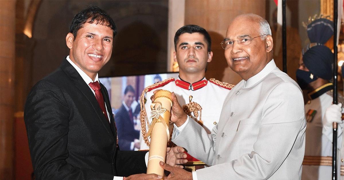 Indian Paralympic javelin thrower Devendra Jhajharia on Monday received his Padma Bhushan award in the field of Sports.