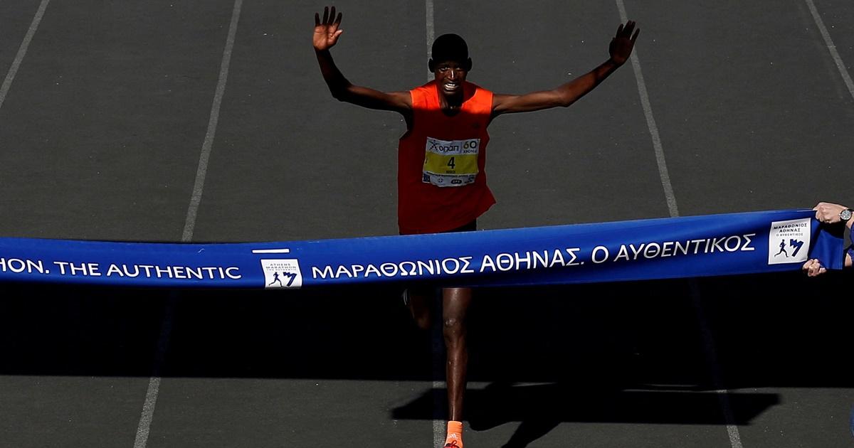 Kenya's Brimin Kipkorir Misoi finishes first in the Athens Marathon, at Athens, Greece,  November 11, 2018.