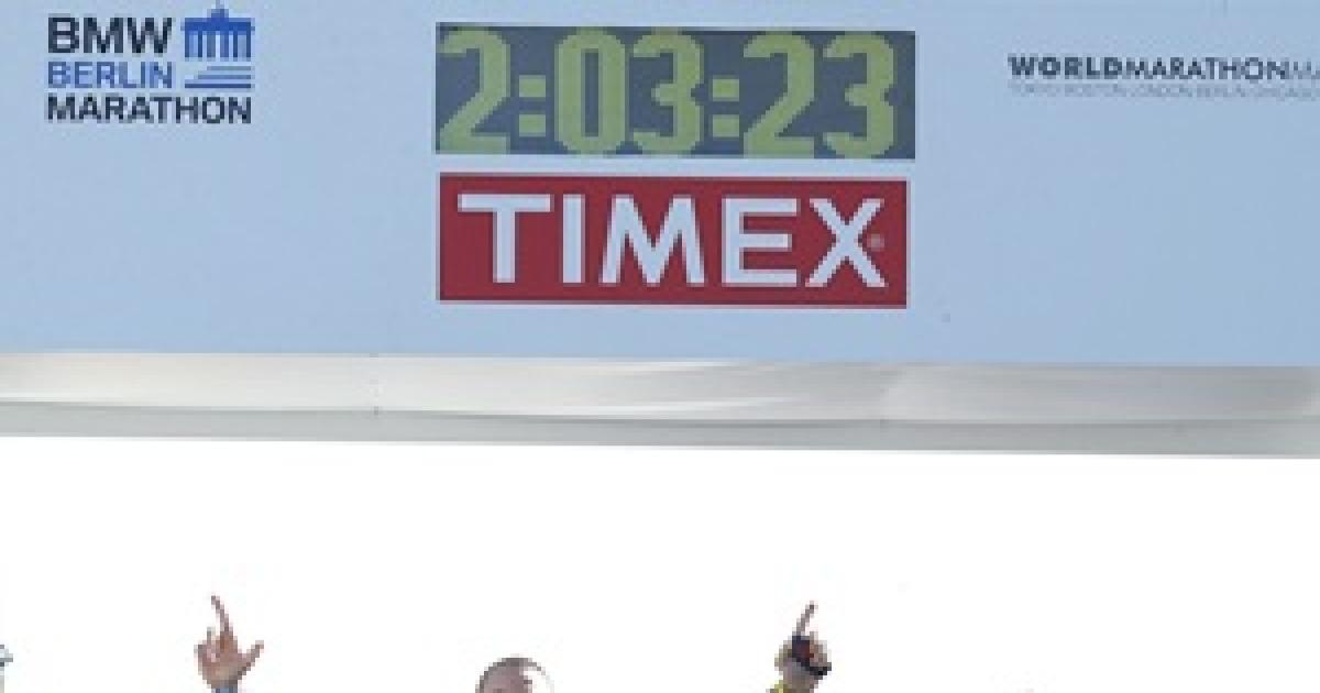 Image: Wilson Kipsang of Kenya (second right) crosses the finish line behind a disrupter at the 40th Berlin marathon