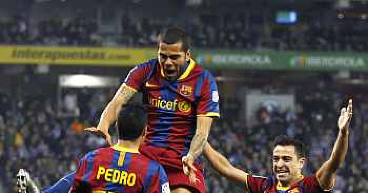 Xavi volleyed in from a tight angle as the hosts struggled to clear their lines in the 30th and Messi burst away from his markers to shoot on the hour. When Carlos Kameni could only parry his shot Pedro raced in to poach the third.