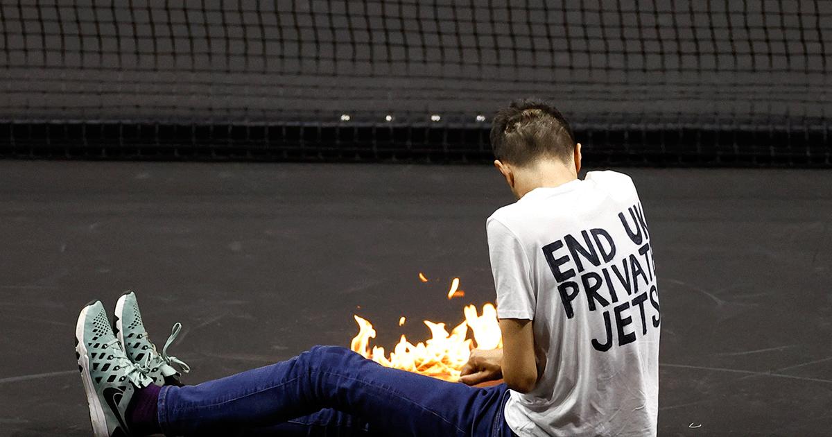 A man ran on to the court in London's O2 Arena and set his arm on fire on Friday to protest the use of private jets in Britain, briefly halting the Laver Cup meeting between Stefanos Tsitsipas and Diego Schwartzman.