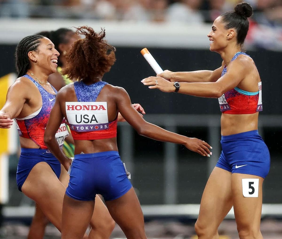 Melissa Jefferson-Wooden became only the second woman to sweep all three sprint titles at one World Athletics Championships after guiding the United States to the gold medal in the women's 4x100 metre relays in a rain-hit on Tokyo on Sunday.
