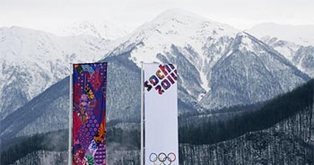 Image: Flags are pictured in front of mountains at the Sanki sliding center at the Rosa Khutor Alpine Resort in Krasnaya Polyana near Sochi, on Sunday