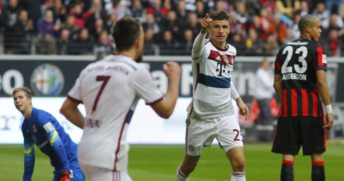 Bayern Munich's Thomas Mueller scored a hat-trick as the undefeated champions crushed Eintracht Frankfurt 4-0 on Saturday to open up a seven-point lead at the top of the Bundesliga.