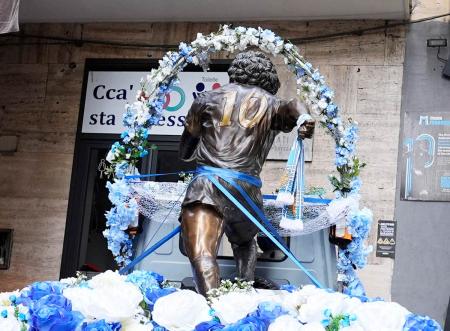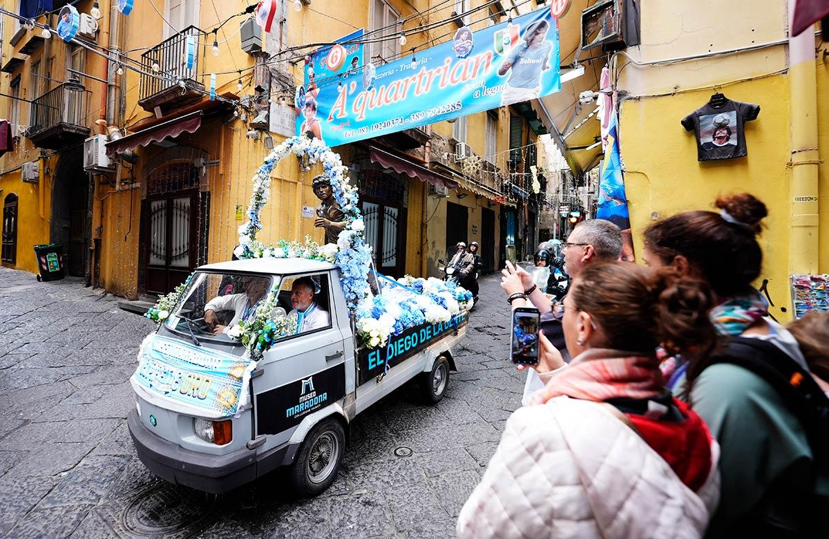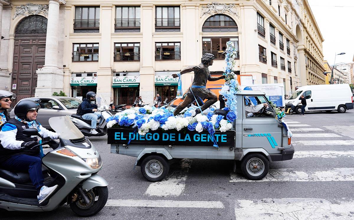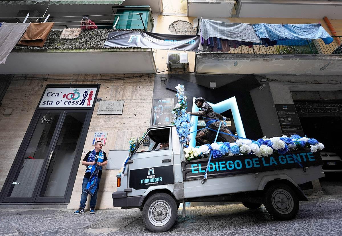 Created by sculptor Domenico Sepe and housed in the Vignati Collection Museum, the statue travelled from the Spanish Quarters to the Stadio Diego Armando Maradona, stopping at landmarks linked to the football legend's life in Naples.