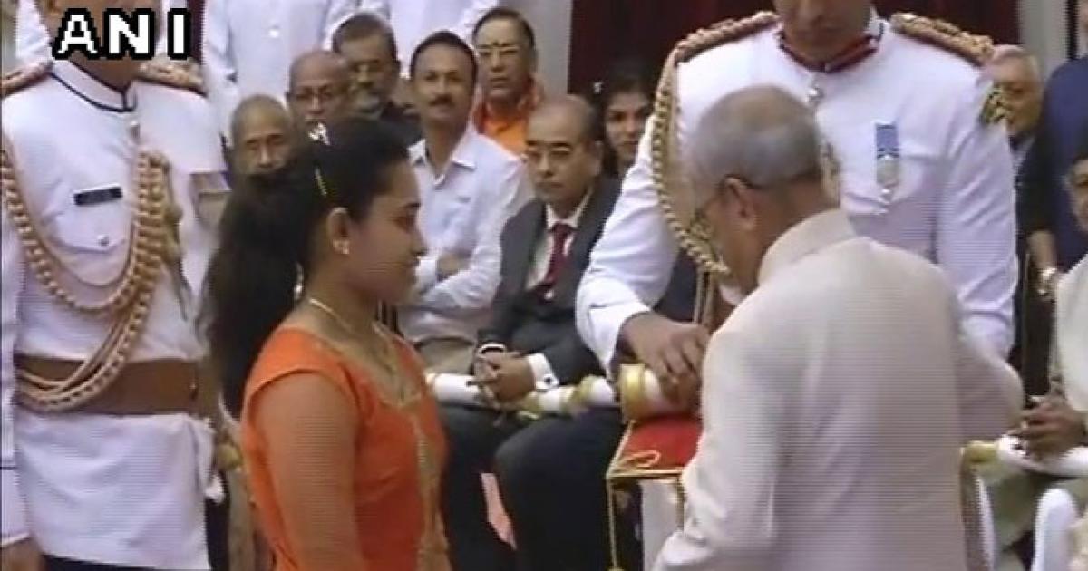 Gymnast Dipa Karmakar receives the Padma Shri from President Pranab Mukherjee on Thursday