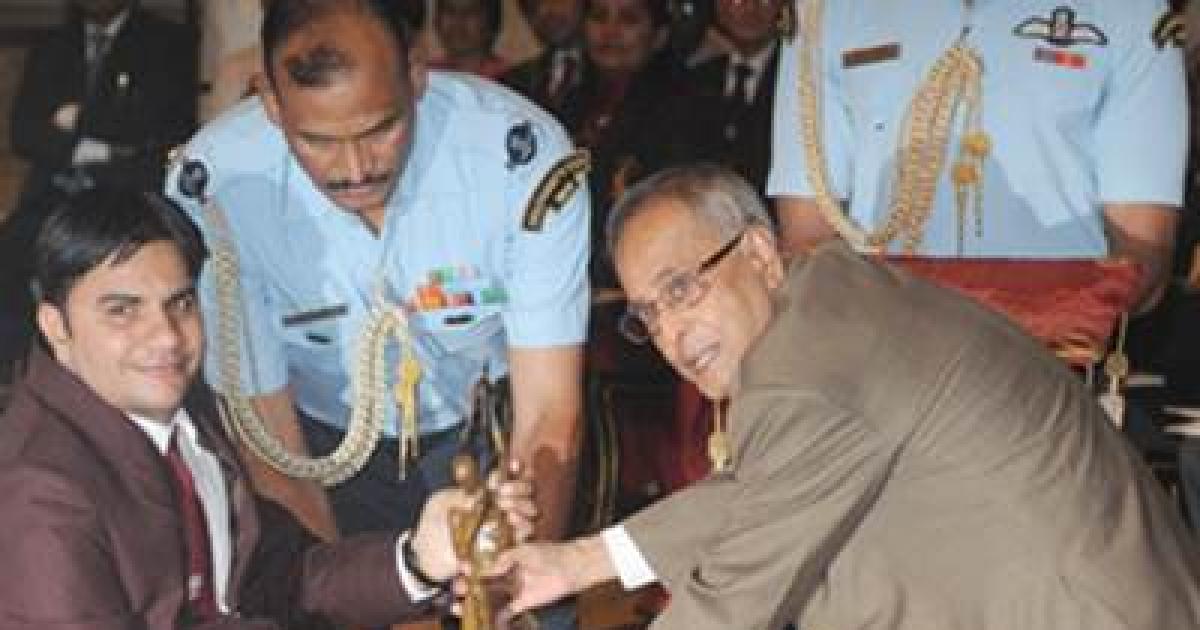 Image: President of India Pranab Mukherjee presents the 2013 Arjuna award to paralympian Amit Kumar Saroha for athletics