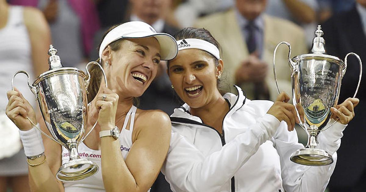 Switzerland's Martina Hingis and India's Sania Mirza pose after winning their women's doubles final against Russian duo Elena Vesnina and Ekaterina Makarova at the Wimbledon Tennis Championships in London on Sunday. Photograph: Toby Melville/Reuters