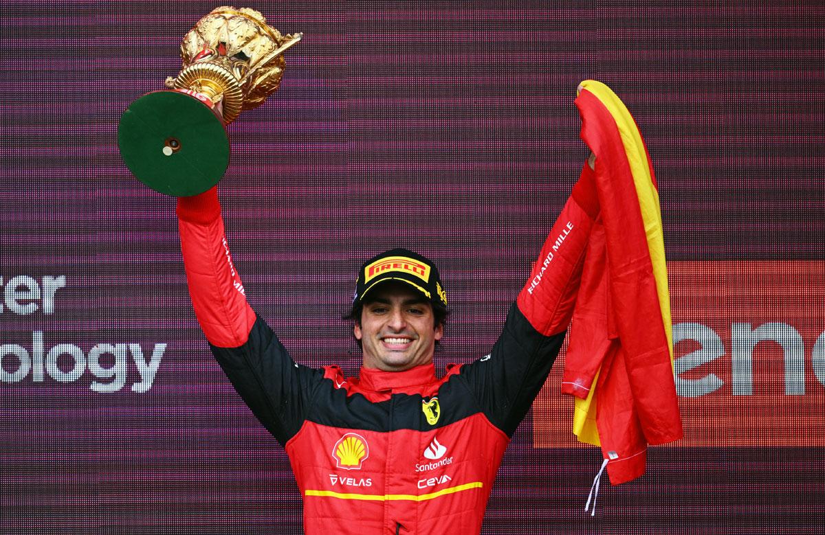 Ferrari's Carlos Sainz claimed his first Formula One victory on Sunday in a thrilling British Grand Prix halted by a first-lap crash and with the added mayhem of a track invasion by protesters.
