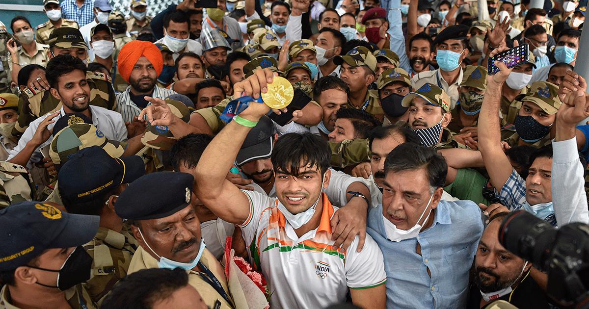 India's triumphant Tokyo Olympics contingent, including history-making Javelin Throw gold-medallist Neeraj Chopra, returned to the country on Monday and was greeted by frenzy and chaos at the New Delhi airport, where supporters jostled to catch a glimpse of their sporting heroes.
