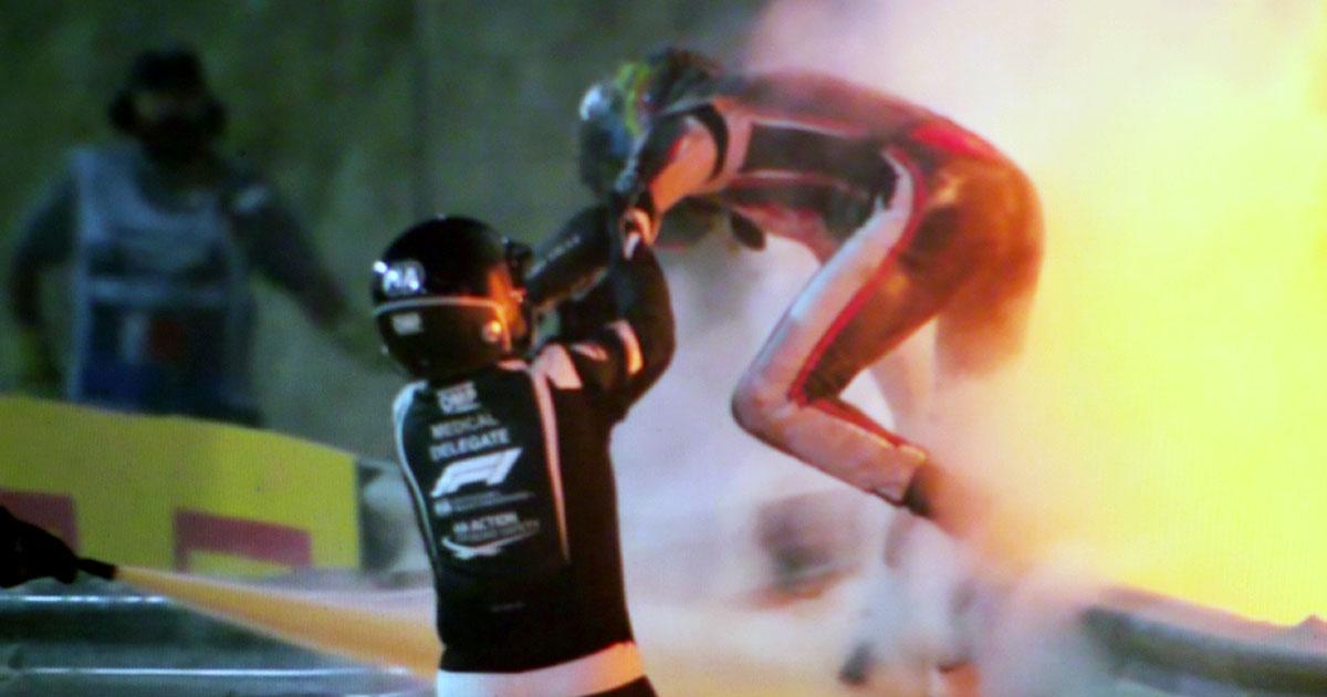 The Frenchman’s Haas car was ripped in half and engulfed in flames as it speared through protective barriers immediately after the start, following contact with the AlphaTauri of Daniil Kvyat.