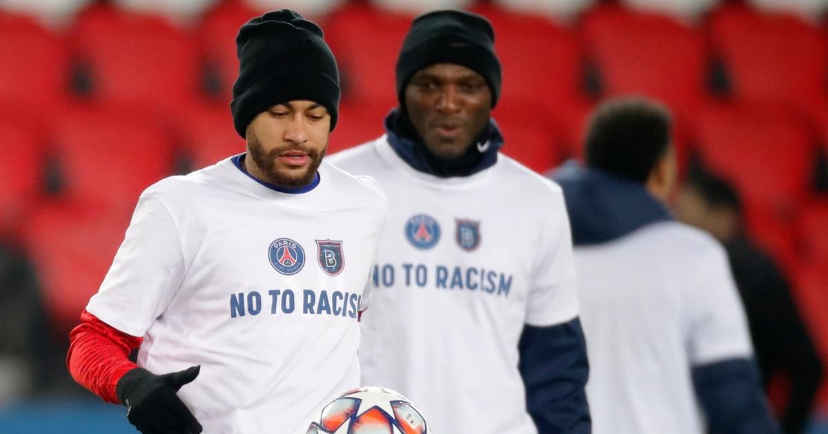 St Germain and Istanbul Basaksehir players wore 'No to racism' t-shirts before their rescheduled Champions League game, which was suspended on Tuesday when the teams walked off in protest after the Turkish club accused a match official of racism.