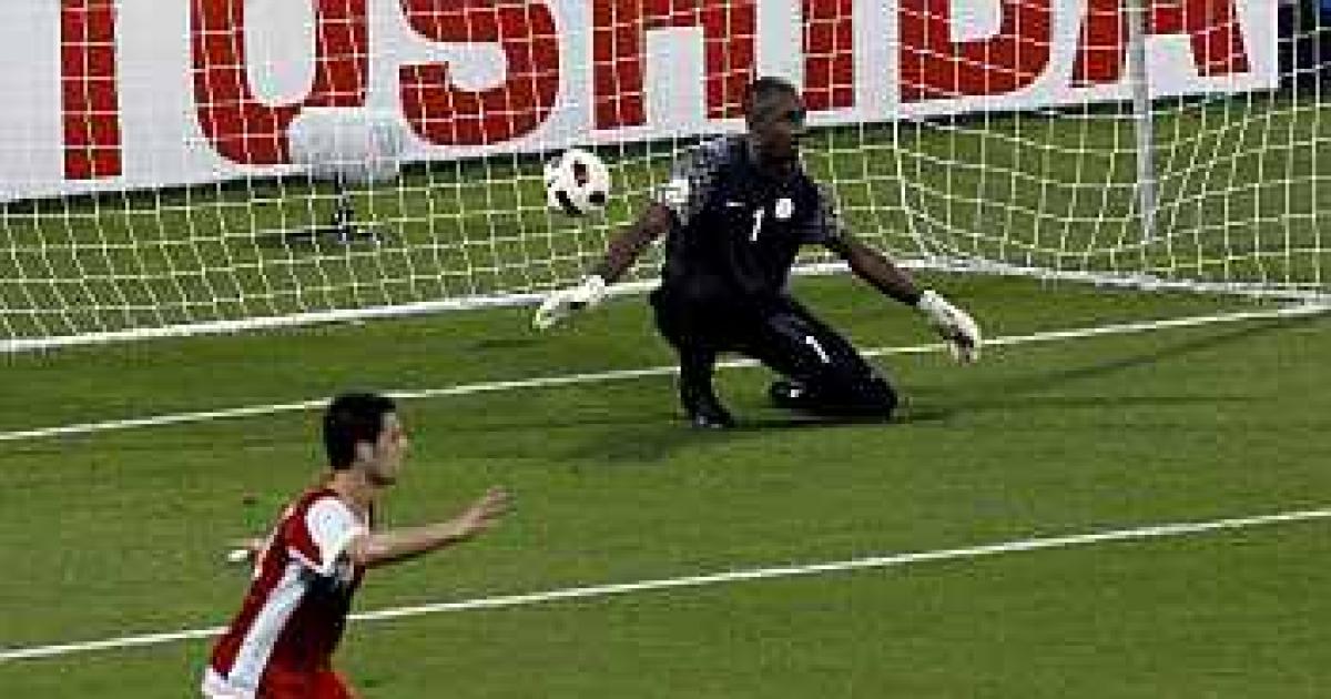 Three minutes before halftime, Jorudan's Bahaa Abdelrahman floated a hopeful, inswinging ball in to the penalty area, which sailed over Abdullah, who had stepped of his line to come for the cross, and in to the corner of the goal.