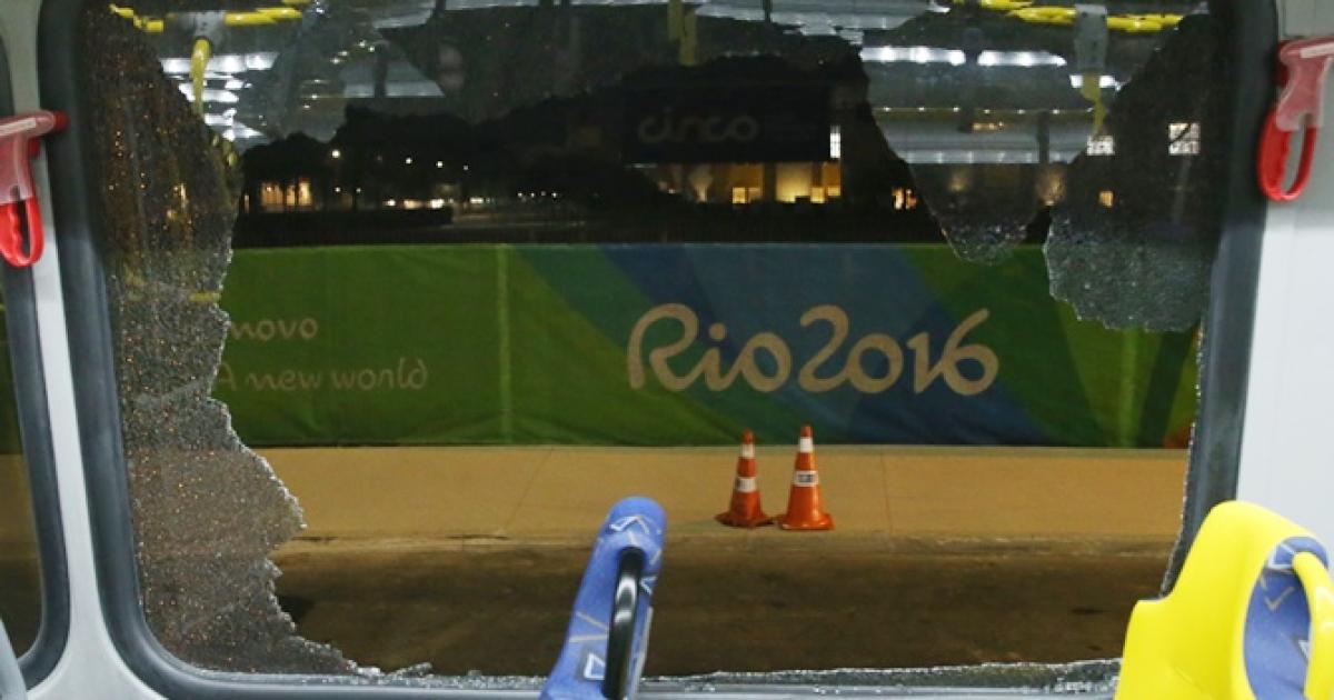 The bus was making its way from the Games basketball venue to the main Olympic park when, according to passengers, two shots were heard hitting the vehicle. Windows shattered and flying glass left two people with minor lacerations.