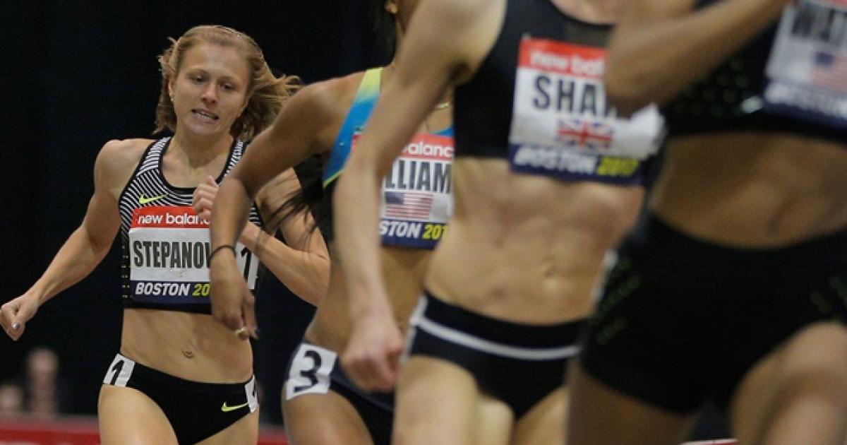 IMAGE: Russian whistleblower and runner Yulia Stepanova, right, who helped expose massive doping problems in Russia that led to the country's track and field team being banned from international competition, competes as a neutral athlete in the 800 meter race at the Boston Indoor Grand Prix . Photograph: Brian Snyder /Reuters.