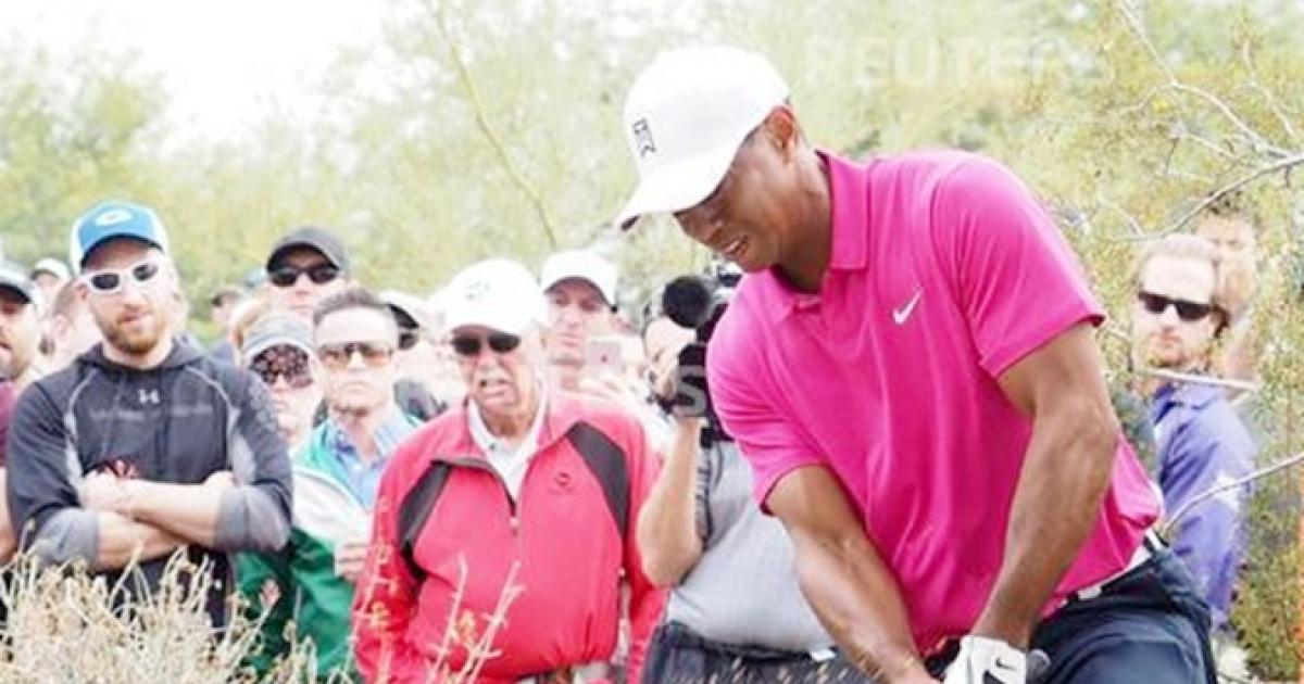 Tiger Woods plays from the desert rough of the 12th during the first round of the Waste Management Phoenix Open at TPC Scottsdale. Photograph: Allan Henry-USA TODAY Sports/Reuters
