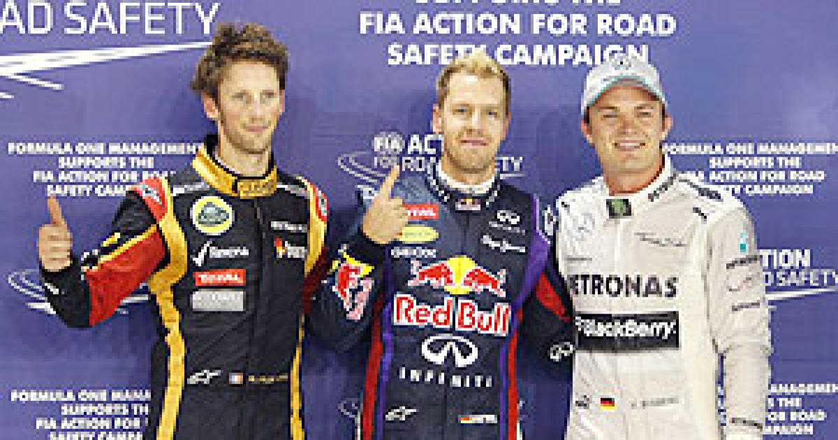 Image: Lotus driver Romain Grosjean of France (left), Red Bull's Sebastian Vettel of Germany (centre) and Mercedes' Nico Rosberg of Germany (right) stand together after the qualifying session of the Singapore F1 Grand Prix at the Marina Bay street circuit in Singapore on Saturday