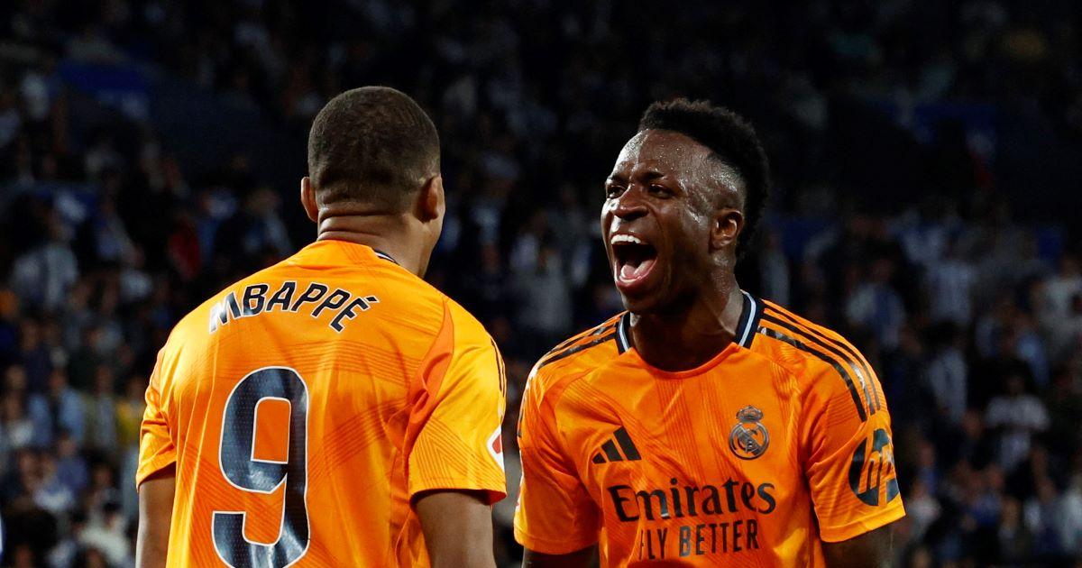 IMAGE: Real Madrid's Kylian Mbappe celebrates scoring their second goal with Vinicius Junior.Photograph: Vincent West / ReutersVinicius, Mbappe penalties give Real Madrid 2-0 win at SociedadReal Madrid's Vinicius Jr and Kylian Mbappe converted second-half penalties to give the champions a hard-fought 2-0 win at Real Sociedad in LaLiga on Saturday.