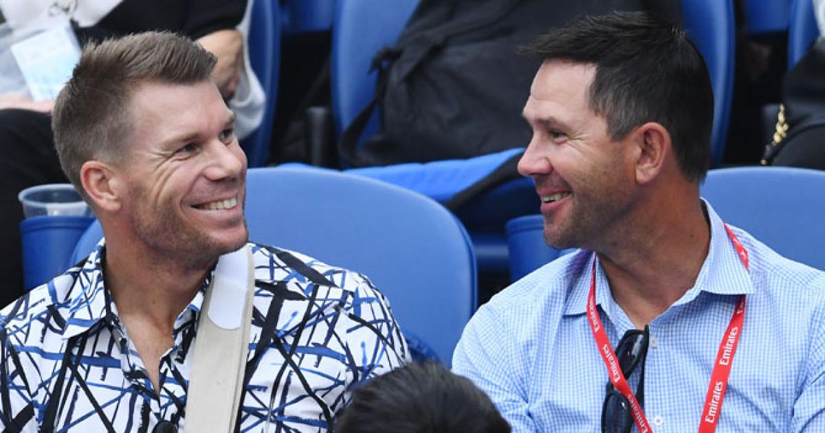 IMAGE: Banned Australian cricketer David Warner and former Australian cricket captain Ricky Ponting chat before the men's semi-final between Serbia's Novak Djokovic and France's Lucas Pouille on Friday. Photograph: Quinn Rooney/Getty Images