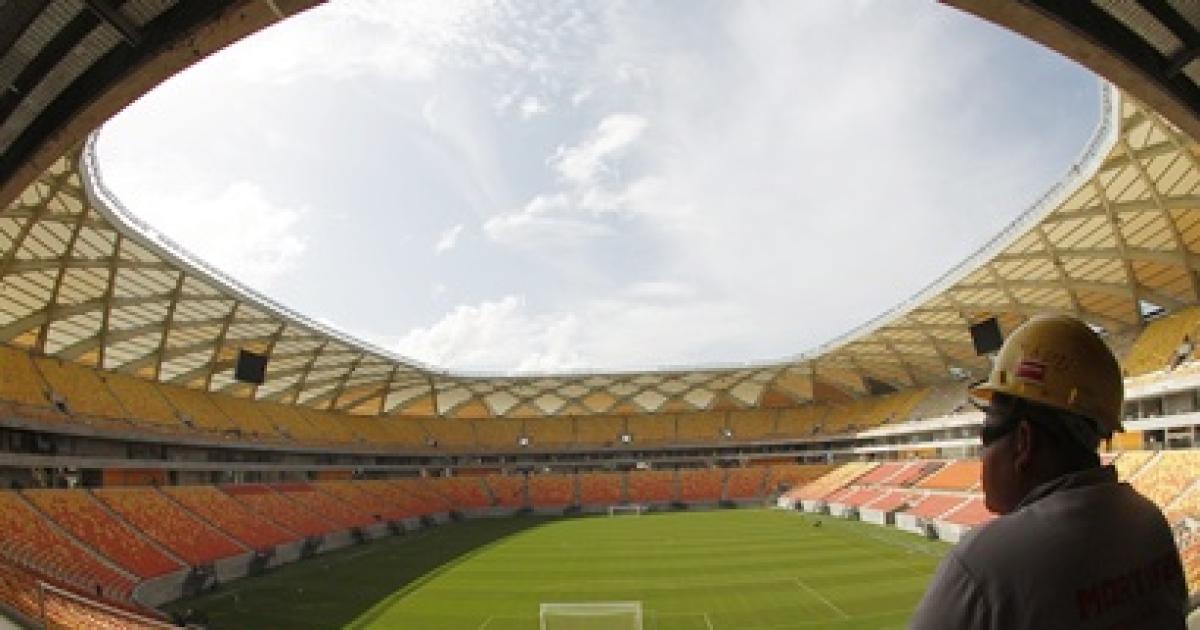 Image: A construction worker looks out over the Arena Amazonia stadium being built to host soccer matches during the 2014 World Cup. According to the construction company, the stadium is 97 per cent complete and will be inaugurated in February.