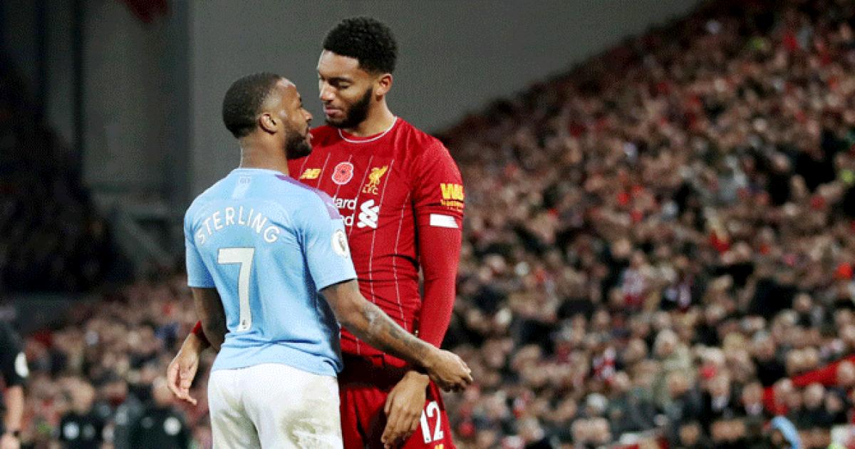 Liverpool's Joe Gomez and Manchester City's Raheem Sterling clash during their English Premier League match at Anfield in Liverpool on Sunday